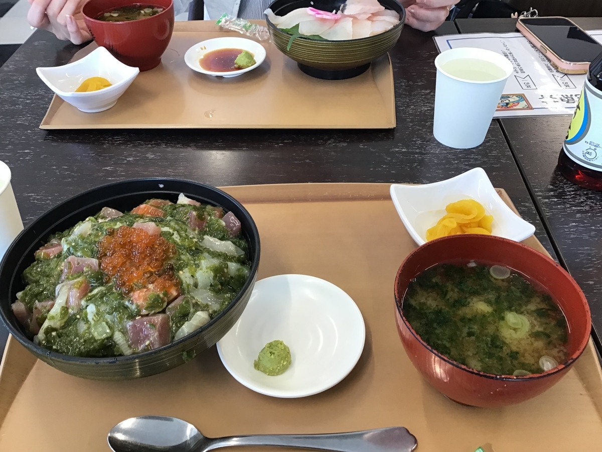 筆者は多彩な魚介類をメカブで和えてご飯に乗せた、漁師の賄い丼を頼んだ。漁師の賄い丼は船上の漁師さんが、忙しい作業の中でも手早くおいしく食べられるようにした漁師めし。