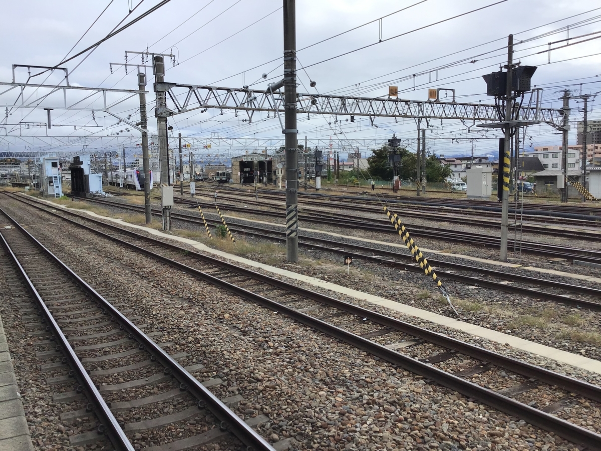 特急あずさや在来線列車が、出発待ちで待機している。