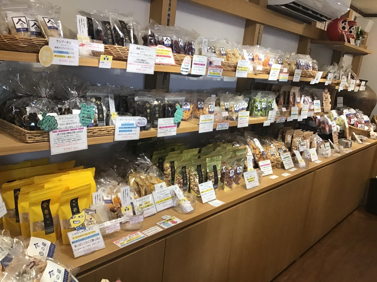 ドライフルーツ・乾燥野菜・甘納豆・チョコレートなど80種類以上の商品が販売されている。この黒い蔵の建物は、松本市歴史的建造物に指定されている。