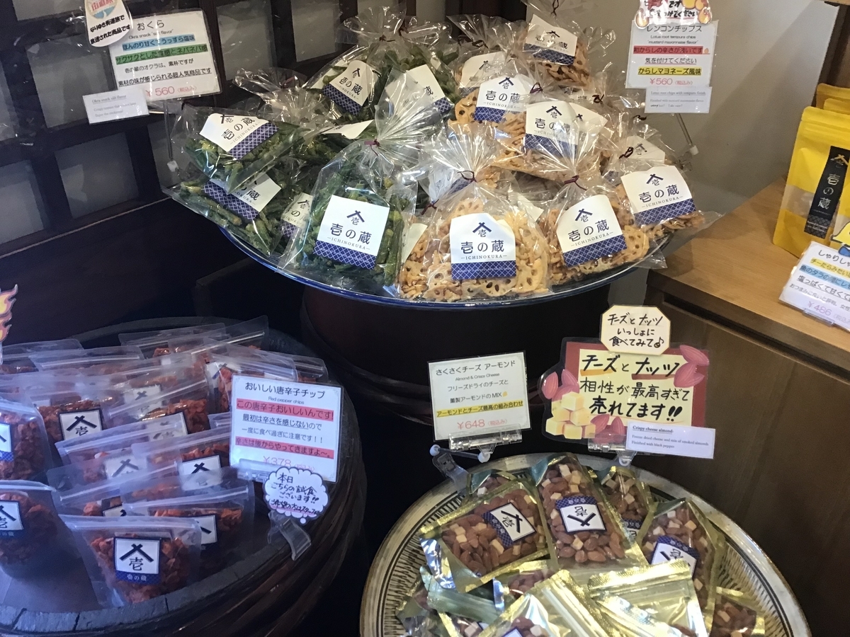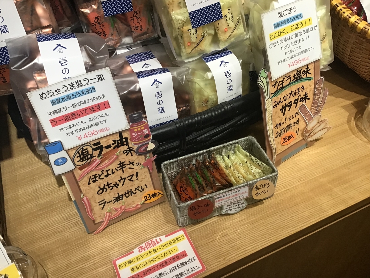 ラー油せんべいは酒のツマミに最高。他にゴーヤスナック、さつまいもチップスなどを買った。