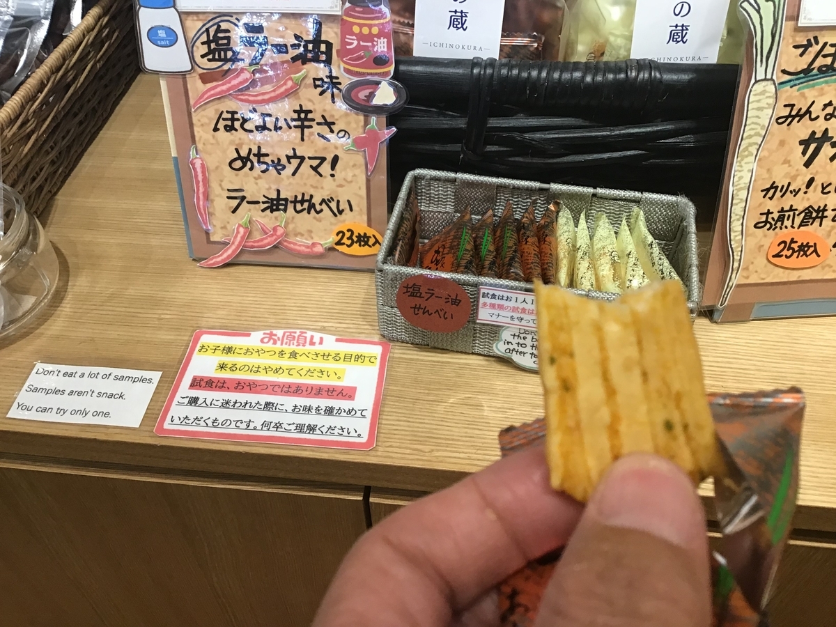 試食もできるので、気に入ったお菓子を食べられる。筆者は辛いのが好きなのでラー油せんべいを食べてみた。