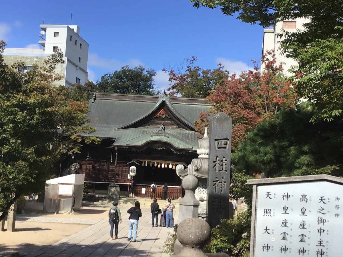縄手通りにある四柱神社。縁結びなど願い事が叶うと言われ、密かな人気のパワースポット。明治時代に神道として建立された。御祭神は天照大神など神話に登場する4つの神様を祀っている。
