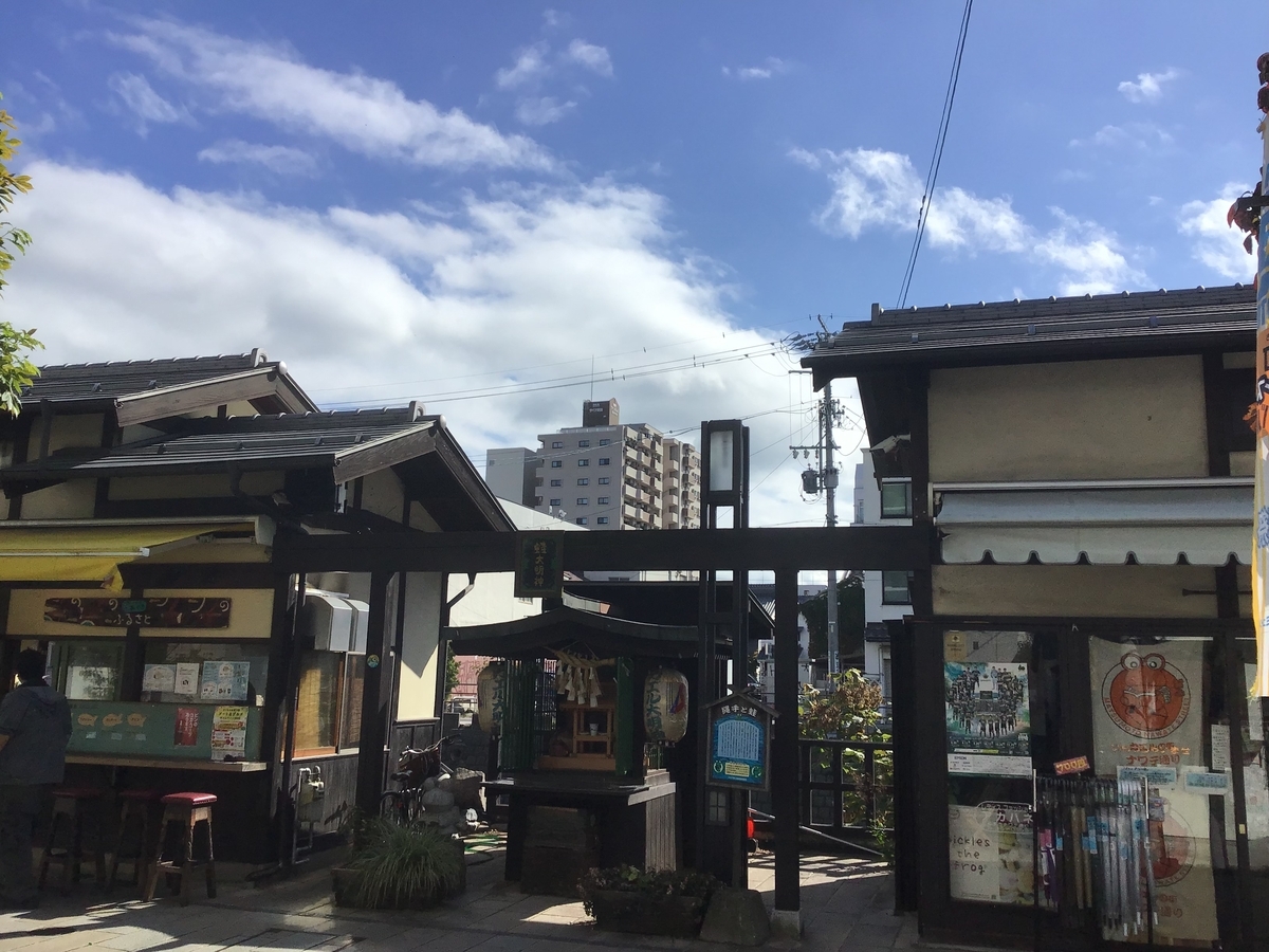 カエル大明神。昭和46年縄手通り商店街組合が結束の象徴として建立した。今では無事にかえると願いを込めて参拝されている。