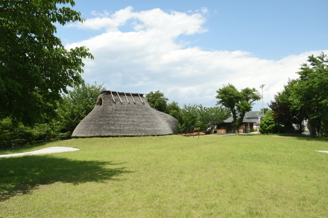 ▼本町田遺跡公園。団地造成の際に発掘調査が行われ、縄文時代の住居跡4軒と弥生時代の住居跡7軒が見つかり、内部見学できる遺跡公園。