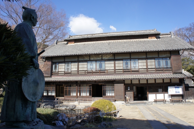 正門の中に入ると主家が見えてきます。左の像は渋沢栄一の銅像です。